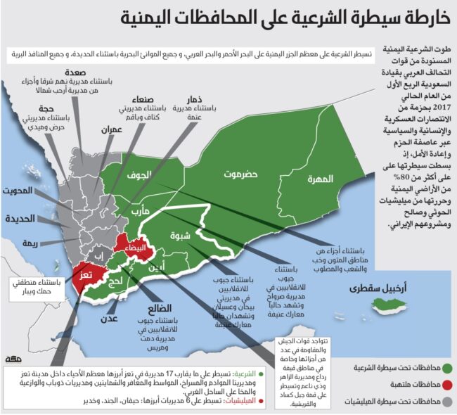 •المملكة العربية السعودية: كان الهدف الرئيسي هو احتواء النفوذ الإيراني وتأمين حدودها الجنوبية. ومع ذلك، توسعت المصالح السعودية خلال الصراع لتشمل تأمين موارد النفط والغاز في المناطق الحدودية المتنازع عليها، والسيطرة على مناطق استراتيجية في شرق اليمن.
